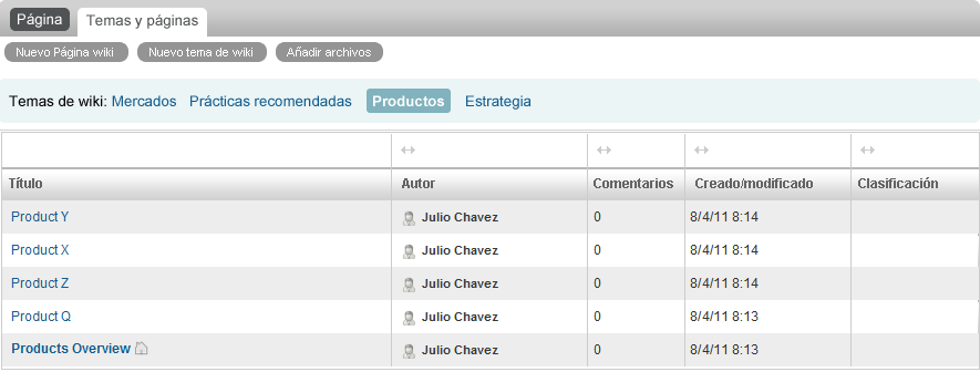 Es posible organizar los temas de wiki para que muestren las páginas ordenadas por > > o