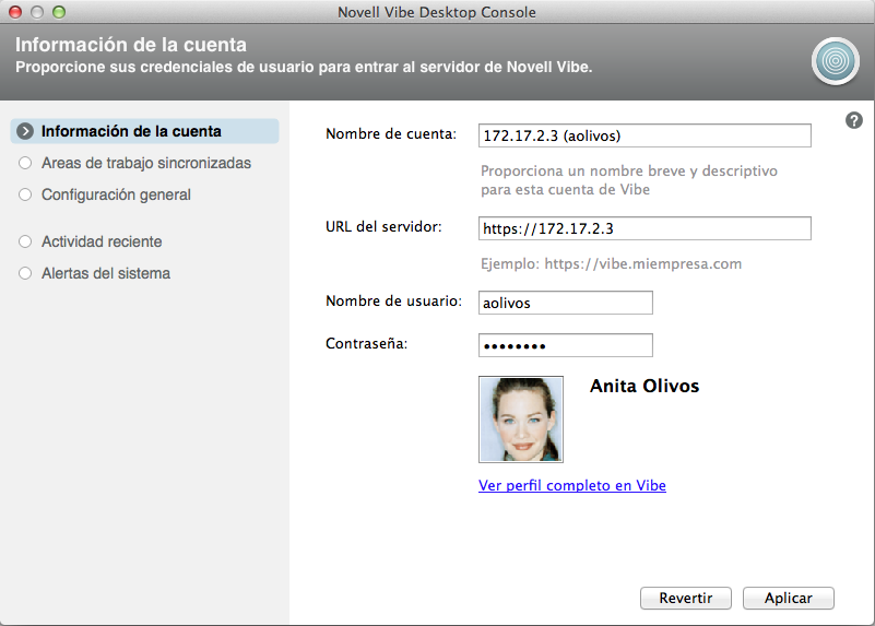 La primera vez que se configura Vibe Desktop, se especifica la información de la cuenta y del servidor de Vibe. Es posible cambiar la información de la cuenta de Vibe Desktop y del servidor de Vibe en cualquier momento después de la configuración inicial: