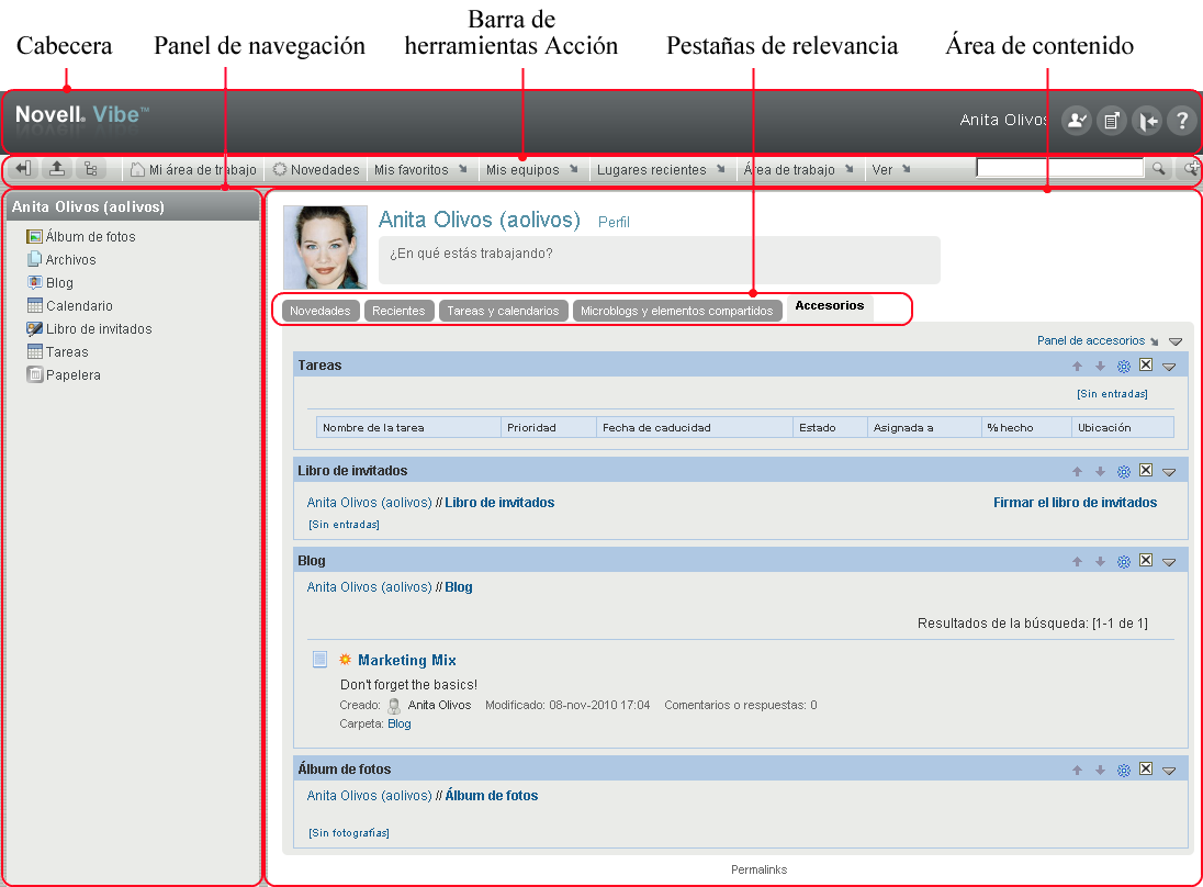 Antes de aprovechar las ventajas de todas las características y funciones de Novell Vibe, es posible que desee personalizar el área de trabajo personal.
