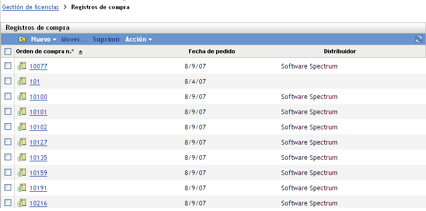 La forma más sencilla de crear registros de compra es importarlos. ZENworks® Asset Management admite varios formatos de registros de compra. Para obtener información acerca de los formatos admitidos, consulte la Sección 2.1.1, Formatos de archivo de importación de ZENworks Asset Management.