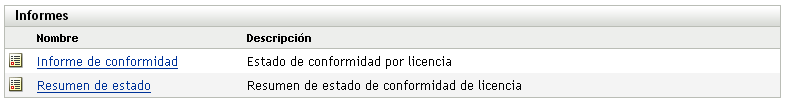 El Centro de control de ZENworks incluye varios informes predefinidos que se pueden usar para analizar la conformidad del software en la zona de gestión. Los informes se agrupan según su función. Los informes disponibles son los siguientes: