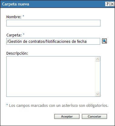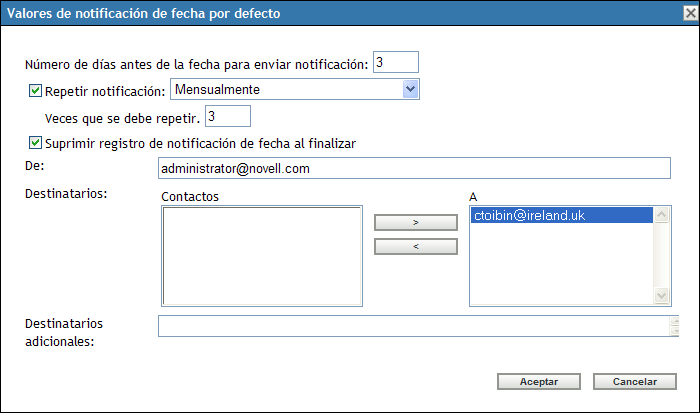 Cumplimente los campos del recuadro de diálogo Valores de notificación de fecha por defecto.