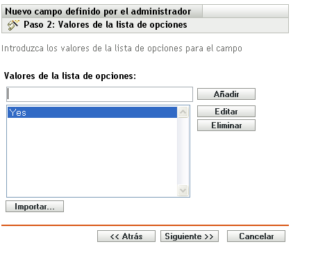 6. (Opcional) Para importar una lista de valores, haga clic en Importar y especifique un archivo en el campo Importar archivo.
