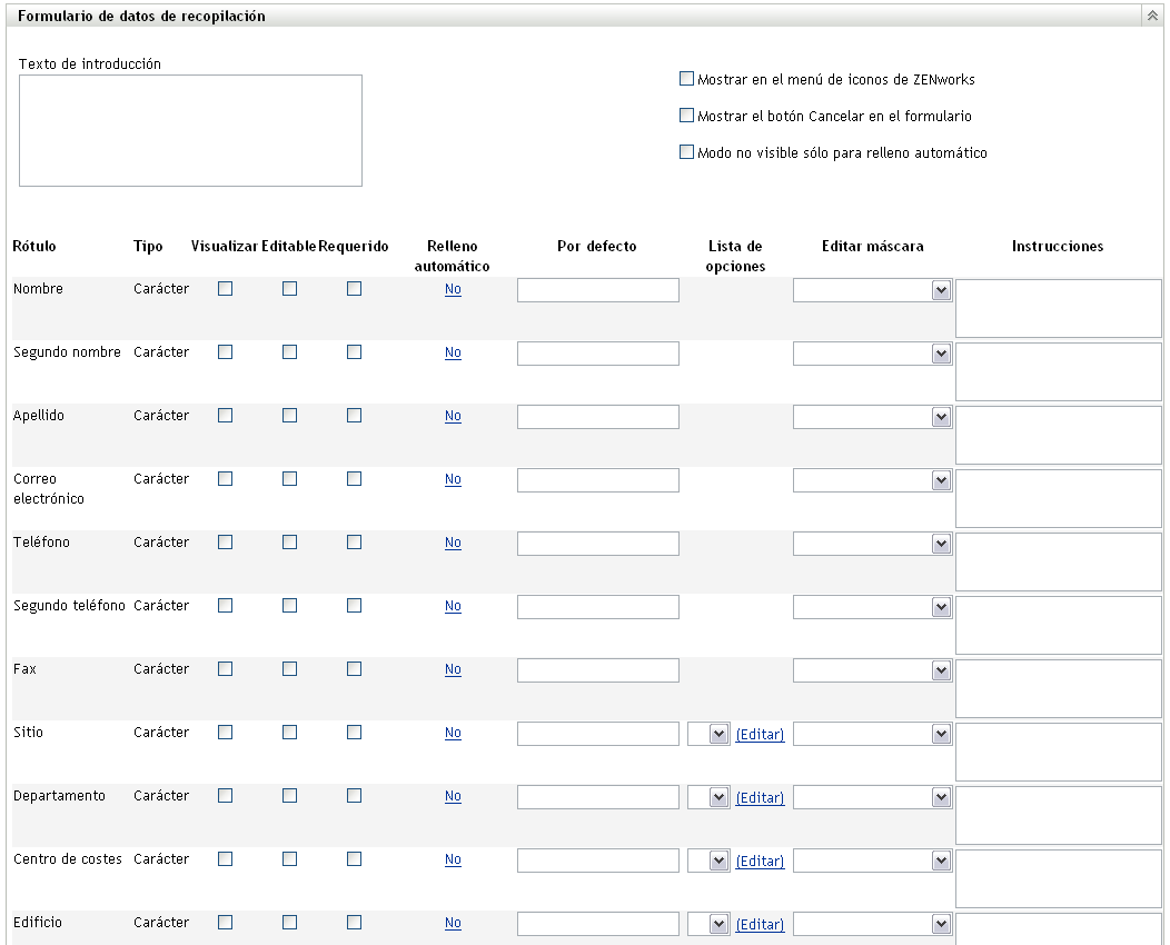 Cuando se configura el formulario de datos de recopilación, se selecciona la información que se desea obtener del usuario de la estación de trabajo. El formulario de datos de recopilación no se configura por defecto, Se debe configurar antes de distribuirlo.