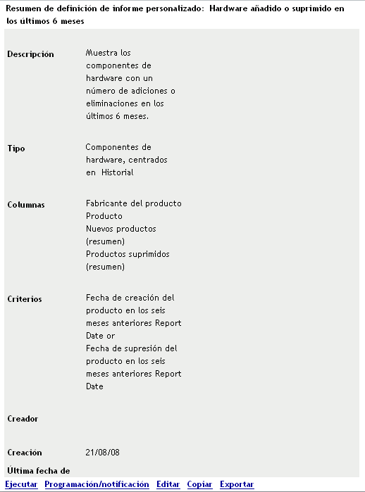 Hardware añadido o suprimido en los últimos 6 meses: muestra una lista de los componentes de hardware de la zona de gestión e indica el número de adiciones y eliminaciones que se han efectuado durante los últimos 6 meses.