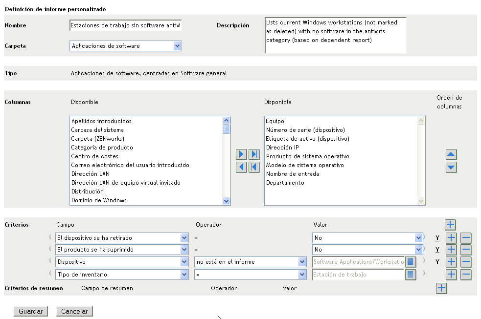 El Centro de control de ZENworks permite crear y ejecutar informes personalizados que se pueden usar para analizar el inventario en la zona de gestión. En las siguientes secciones encontrará más información: