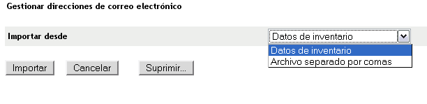 El panel Direcciones de correo electrónico de la página Configuración permite importar direcciones de correo electrónico que se pueden utilizar para enviar notificaciones cuando un informe personalizado esté listo, tal y como se haya configurado en la definición del informe. Las direcciones de correo electrónico importadas anteriormente aparecerán en el panel, junto al nombre y los apellidos del usuario.