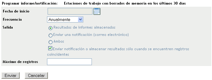 Salida: especifique si desea almacenar el informe, enviar una notificación por correo electrónico indicando que el informe está listo o ambas cosas. También puede indicar que se almacenen los resultados o que se envíe una notificación sólo cuando se encuentren registros coincidentes. Para obtener información sobre la configuración de direcciones de correo electrónico, consulte la Sección 8.2.5, Configuración de direcciones de correo electrónico.
