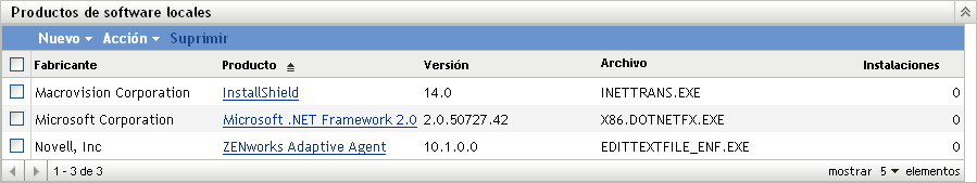 Este panel muestra los productos de software locales que ya se han creado, junto a los detalles siguientes: