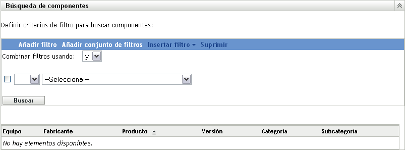 Para poder ver los datos de componentes, es necesario buscar los componentes. Las búsquedas de componentes se realizan desde el panel Búsqueda de componentes (Configuración > Inventario de activos).