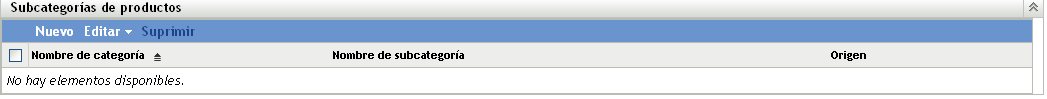 Se mostrará el panel Subcategorías de productos, en el que se muestran las subcategorías predefinidas para la categoría especificada, así como el origen de la subcategoría, que puede ser o