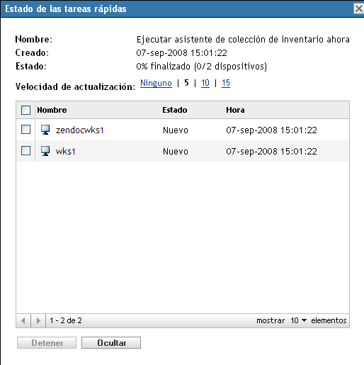 El recuadro de diálogo Estado de las tareas rápidas mostrará el progreso de la distribución. Cuando haya terminado, el formulario de datos de recopilación aparecerá en la pantalla del dispositivo (o de los dispositivos, si hay varios). Para detener la distribución, seleccione la estación de trabajo y haga clic en Detener.
