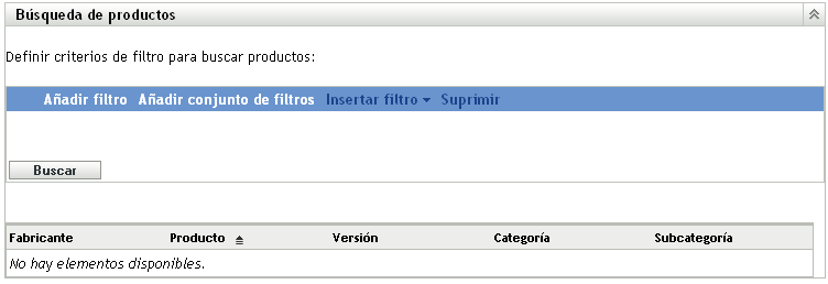 El panel Búsqueda de productos permite seleccionar filtros y conjuntos de filtros para buscar un producto específico y, a continuación, muestra una lista con los productos y la siguiente información: