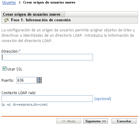 Especifique la información requerida para crear una conexión con el directorio LDAP: