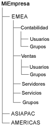 Puede añadir MiEmpresa/EMEA/Contabilidad como un contenedor de usuarios, MiEmpresa/EMEA/Ventas como un segundo contenedor y MiEmpresa/EMEA/Grupos como un tercer contenedor. Sólo estos contenedores serán visibles como carpetas bajo la referencia al directorio MiEmpresa en el Centro de control de ZENworks.