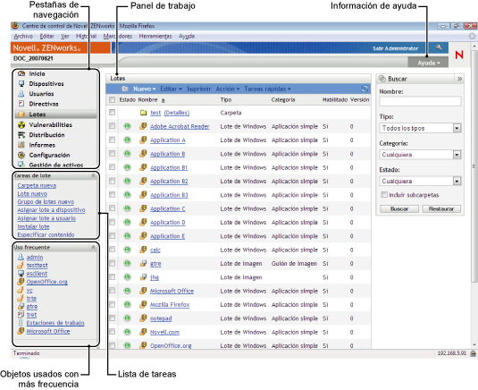 Panel de trabajo: los paneles de trabajo permiten monitorizar y gestionar el sistema ZENworks. Los paneles cambian en función de la página actual. En el ejemplo anterior, se muestran dos paneles de trabajo: Dispositivos y Buscar. El panel Dispositivos muestra los servidores, las carpetas, los grupos de servidores y los grupos de servidores dinámicos que se han creado. Este panel permite gestionar los servidores. El panel Buscar permite filtrar el panel Dispositivos según criterios como el nombre del dispositivo, el sistema operativo o su estado.
