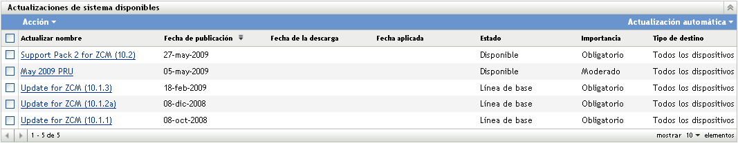 Cuando la actualización haya terminado de descargarse, su estado cambiará automáticamente a Descargado. La cantidad de tiempo para descargar una actualización depende del tamaño de ésta y de la configuración del hardware.