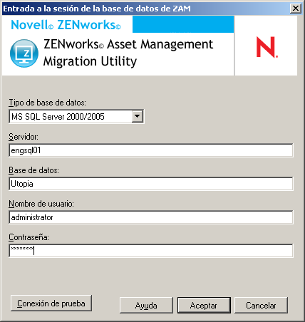 Figura 2-4 Entrada a la sesión de la base de datos de ZAM para la migración de Microsoft SQL Server