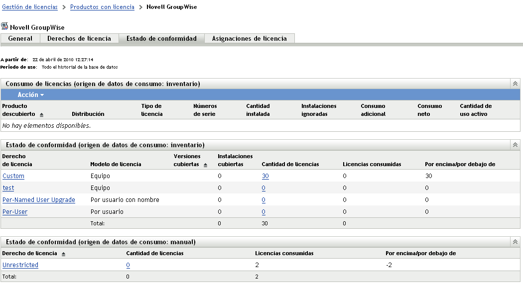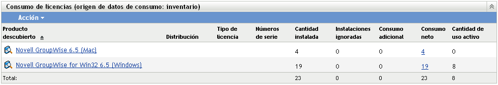Consumo de licencias (origen de datos de consumo: inventario): muestra los datos de instalación de los productos descubiertos asociados al producto con licencia.