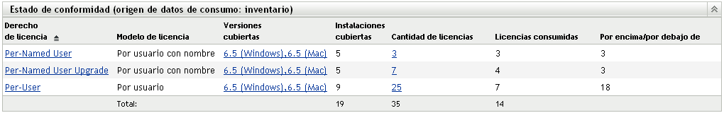Estado de conformidad (origen de datos de consumo: inventario): muestra el estado de conformidad de todos los derechos que usan los datos de instalación del inventario.