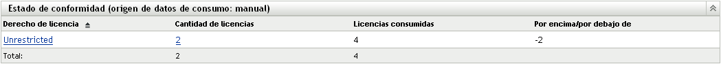 Sobre/bajo: muestra el estado de conformidad de la licencia. 0 indica que el número de licencias consumidas () es igual al de licencias disponibles (). Un número negativo indica que las licencias consumidas superan el número de licencias disponibles (se encuentra por debajo del nivel de conformidad). Un número positivo indica que las licencias disponibles superan el número de licencias consumidas (se encuentra por encima del nivel de conformidad).