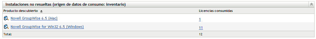 Este panel muestra todos los productos descubiertos con instalaciones que no pueden consumir una licencia del derecho.