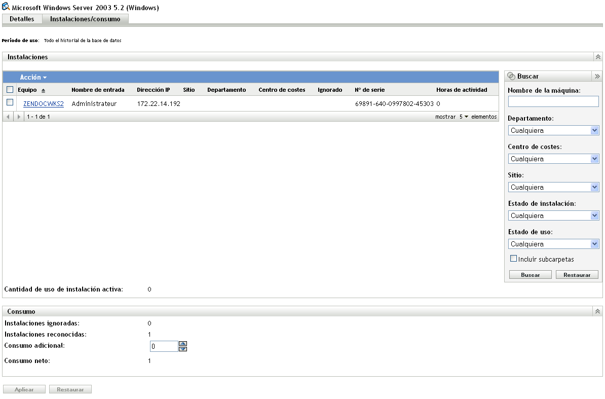 Para añadir instalaciones al recuento, use el campo del panel Consumo para seleccionar el número de instalaciones adicionales.