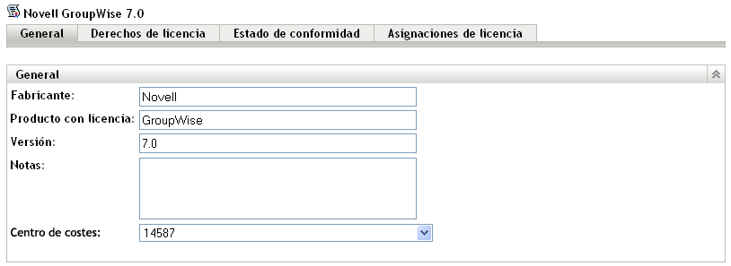 Los productos con licencia incluyen información general, como el fabricante, el nombre del producto y la versión. Puede modificar esta información como estime oportuno. Si ha creado campos personalizados (consulte la Sección 6.7, Adición de campos personalizados a los productos con licencia), también puede modificarlos.