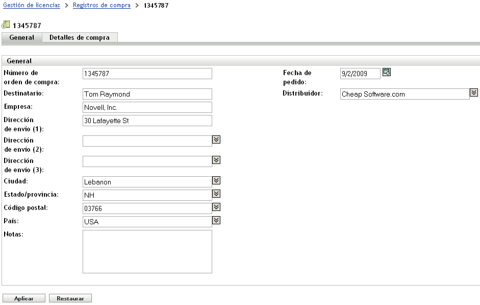 Los registros de compra incluyen información general, como el número de orden de compra, el nombre y la dirección del destinatario, la fecha de compra y el proveedor. Puede modificar esta información como estime oportuno.