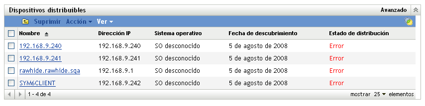 Los dispositivos que cumplen los requisitos para ZENworks Adaptive Agent se muestran en el Centro de control de ZENworks, en el panel Dispositivos distribuibles de la página Distribución.