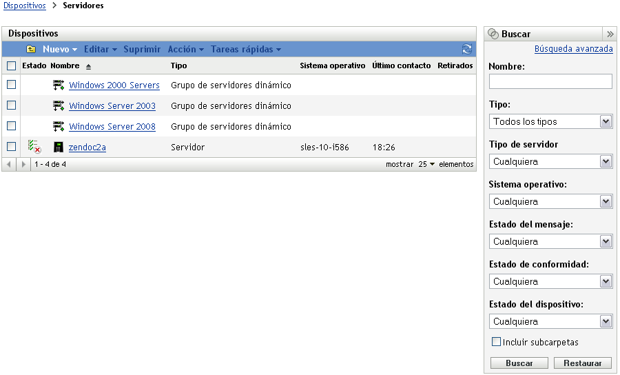 Figura 7-1 Página Dispositivos gestionados > carpeta Servidores