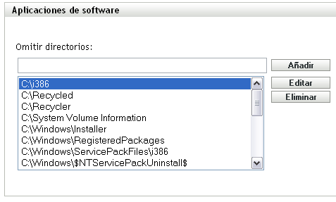 En el panel Aplicaciones de software, configure los directorios que se deben omitir.