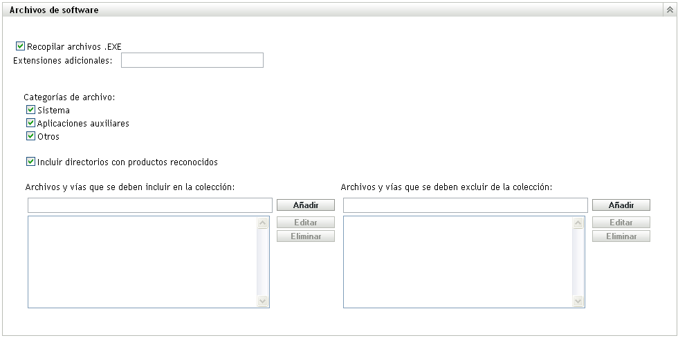 Para limitar el ámbito de la exploración incluyendo y excluyendo archivos y vías, configure los archivos y las vías que se deban incluir o excluir de la recopilación utilizando y Puede editar los archivos y vías de la lista seleccionando la vía o el archivo y haciendo clic en Si indica una vía o archivo en el campo la exploración se limitará a la vía o al archivo que haya especificado. Si introduce una vía o archivo en el campo la exploración se realiza en todas las vías y los archivos excepto en los especificados. Las vías indicadas en el panel también se omitirán.