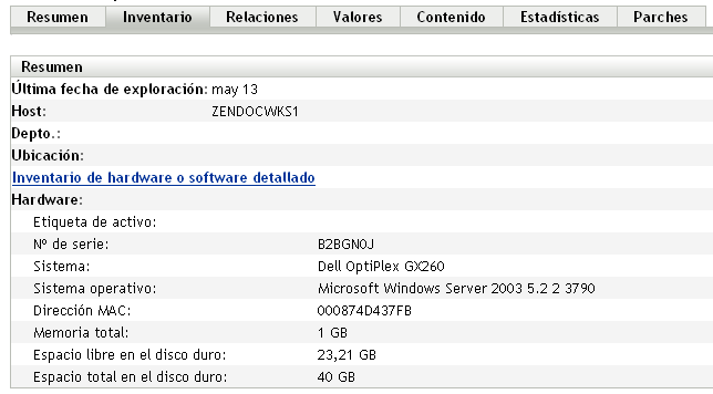 En él se muestra información detallada acerca del dispositivo, incluidos los datos demográficos y la información de hardware y de software. Desde esta página se puede hacer clic en los distintos vínculos para obtener más información detallada. Se puede exportar el informe a los formatos Excel*, CSV o PDF. También se pueden editar datos seleccionados. Para obtener más información, consulte la Sección 2.5, Edición de los datos de inventario de un dispositivo gestionado.