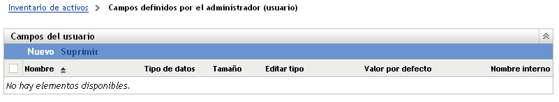El panel Campos de usuario muestra los campos definidos existentes, junto con la siguiente información: