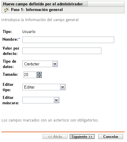 Nombre: nombre del campo definido por el administrador. Este campo es obligatorio.