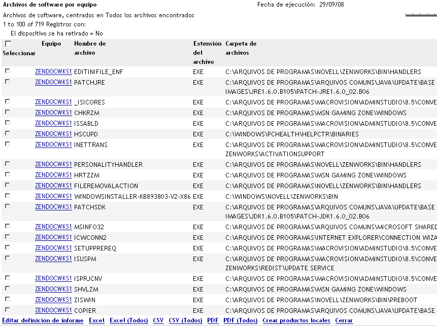Cuando se hace clic en se abre una definición de informe que se puede ejecutar para mostrar todos los archivos de software de cada equipo de la zona de gestión, en función del modo en que se haya configurado la exploración de inventario.