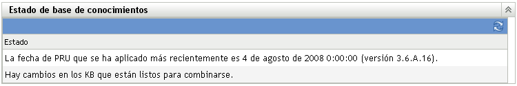 El panel Estado de base de conocimientos () muestra la fecha de la última actualización de reconocimiento de productos (PRU); también indica si hay algún producto de software local recién definido listo para fusionarlo con la base de datos de conocimientos.