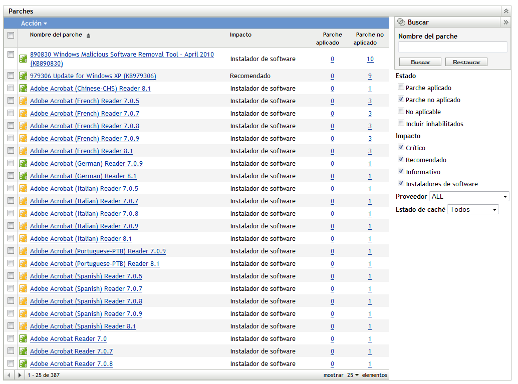 Un parche está formado por una descripción, las firmas y las huellas necesarias para determinar si el parche está aplicado o no. Un parche está compuesto además de lotes de parches asociados para distribuir el parche. La página Parches muestra una lista completa de todos los parches conocidos de los que han informado distintos proveedores de software. Después de documentarlos y analizarlos, los parches se registran para su distribución en el servidor de ZENworks a través de la red de suscripciones a parches de ZENworks. ZENworks Adaptive Agent debe haberse instalado en cada dispositivo para poder comprobar si hay parches conocidos. Un lote de parches denominado “descubrimiento de actualizaciones aplicables” se asigna entonces para que se ejecute en cada dispositivo diariamente con el fin de explorar los parches conocidos. Esta tarea devuelve los resultados que se muestran en la página Parches. Los resultados se muestran en una tabla de estado de los parches. El número total de parches se muestra debajo de la tabla, en la esquina inferior izquierda.