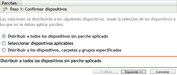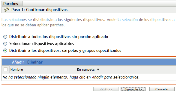 Elija para distribuir el parche a dispositivos, carpetas o grupos específicos que no tengan un parche aplicado. Después, continúe en la Sección 5.2.3, Confirmar dispositivos: Seleccionar dispositivos, carpetas y grupos.