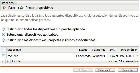 NOTA:Si distribuye un parche desde la página Gestión de parches, la lista de dispositivos que aparece se base en el filtro del parche que elija.