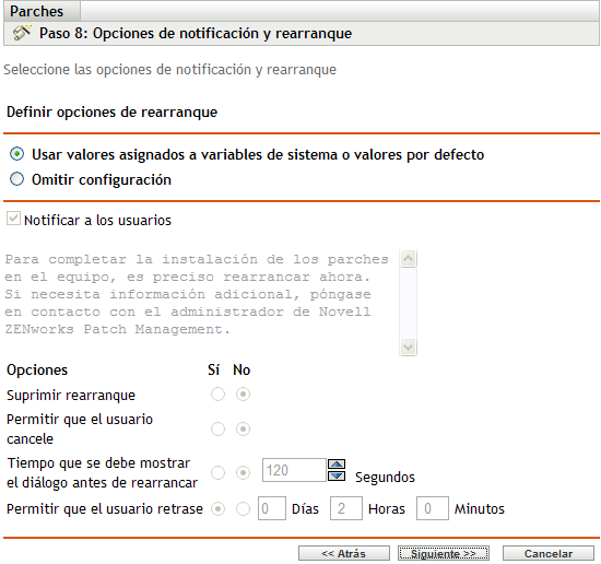 Usar valores asignados a variables de sistema o valores por defecto: seleccione esta opción para usar los valores de configuración por defecto de cada agente. Esta opción inhabilita todas las demás opciones de notificación de rearranque.