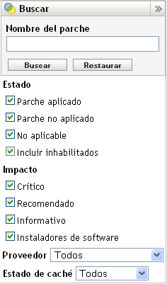 La sección de la página Parches ofrece una amplia variedad de opciones de búsqueda y filtrado de datos que permiten buscar parches específicos y filtrar los resultados según el estado o el impacto de los parches. Las búsquedas y el filtrado se pueden llevar a cabo de forma independiente o se pueden combinar para proporcionar amplias posibilidades de detalle. La siguiente ilustración muestra la sección de búsqueda de parches: