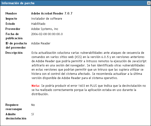 Informativo: este tipo de parche detecta una condición que Novell ha determinado como informativa. Los parches de información se utilizan únicamente con fines informativos. No hay ningún parche real instalado.