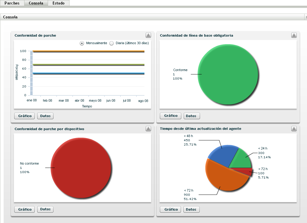 La consola satisface las necesidades de informes operativos, de gestión y de conformidad con una consola gráfica y cuatro informes estándar que recogen información sobre los parches, su distribución, su estado, las tendencias, el inventario, etc. en un solo equipo o en grupos de equipos. Con ello se dispone de una vista unificada para dar prueba de los progresos realizados para cumplir los requisitos de auditorías externas e internas y de conformidad. Se puede actualizar la consola haciendo clic en en el menú de la pestaña