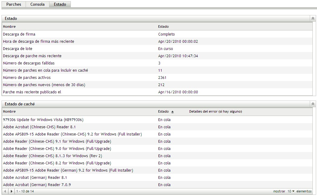 La página Estado incluye el estado del sistema y del caché, que muestra información general acerca de los parches. Para obtener más información, consulte la Sección 4.3, Estado.