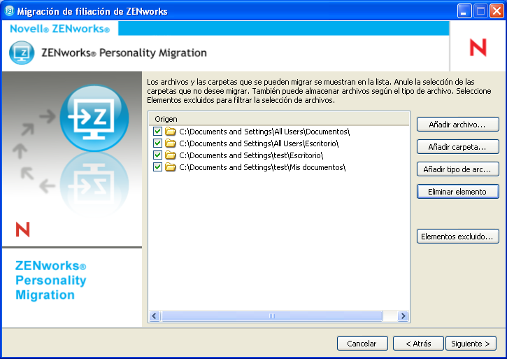 Esta página también permite añadir archivos, carpetas o archivos de tipos concretos a la lista de archivos para la migración.