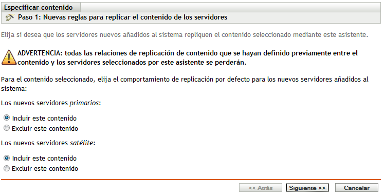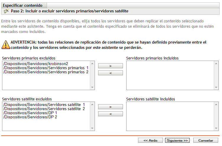 Las relaciones entre el contenido y los servidores de contenido que cree mediante este asistente anularán las relaciones existentes. Por ejemplo, si la Directiva A está almacenada en el Servidor 1 y en el Servidor 2 y utiliza este asistente para almacenarla sólo en el Servidor 1, la Directiva A se excluirá del Servidor 2 y se eliminará durante la siguiente replicación programada.