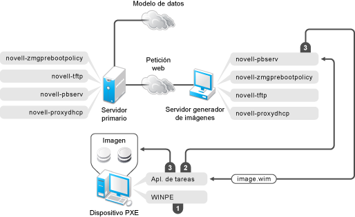 Figura 2-2 Proceso de los servicios de prearranque para ZENworks Imaging en el satélite generador de imágenes