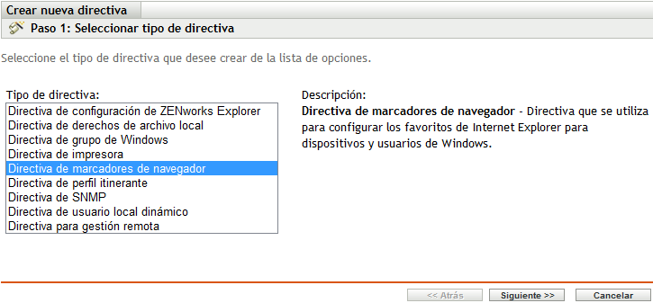 Haga clic en el botón de cada página del asistente para obtener información detallada acerca de la página. Cuando complete el asistente, la directiva se añadirá al panel Directivas. Se puede hacer clic en la directiva para ver sus detalles y modificar las asignaciones, la programación, etc.